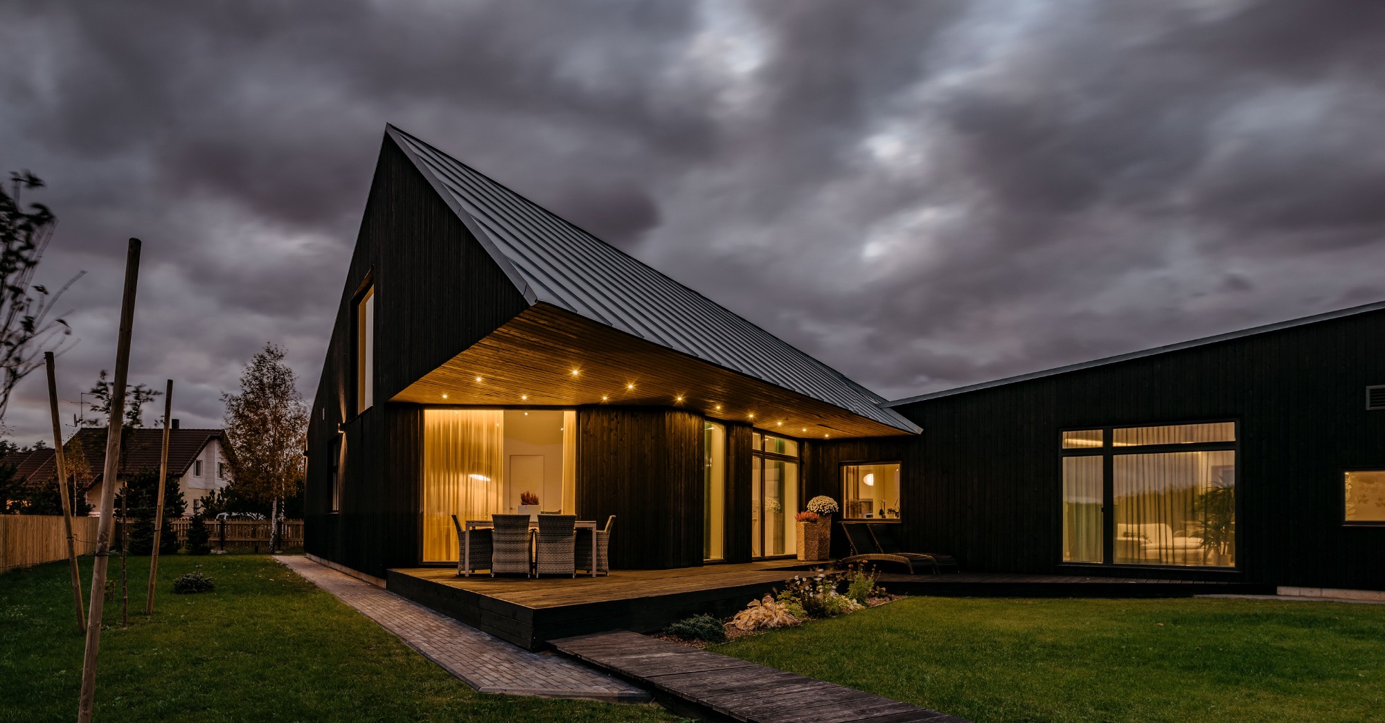 One story high building is located in Saue Parish Koidu Village in a private housing area. The geometry of the house is inspired by the plot itself and the movement of the sunlight to catch as much warm southern and western sunlight as possible. The building is a shape-shifter offering different views from every angle.